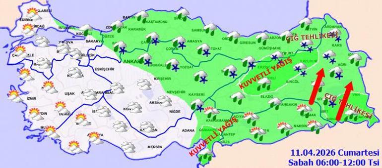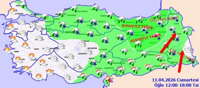 Yarın ve pazar günü Erzincan, Bayburt ve Gümüşhane'nin güney çevrelerinde, Bingöl'ün doğusu, Erzurum, Muş, Bitlis, Diyarbakır'ın kuzeyi, Siirt, Batman'ın kuzeyi, Van'ın batısı ve Şırnak'ta aralıklı ve yerel olmak üzere kuvvetli yağışın etkili olacağı ifade edildi.