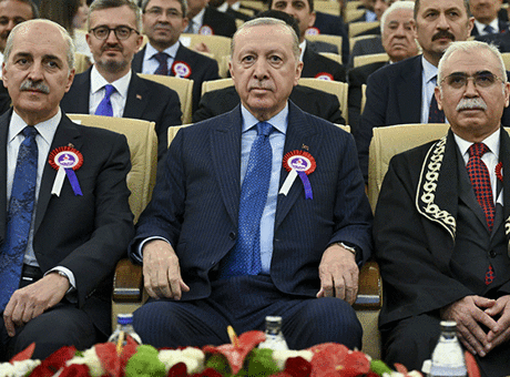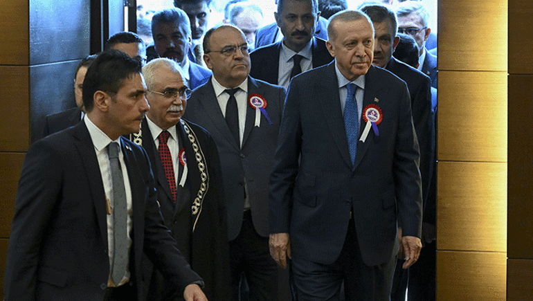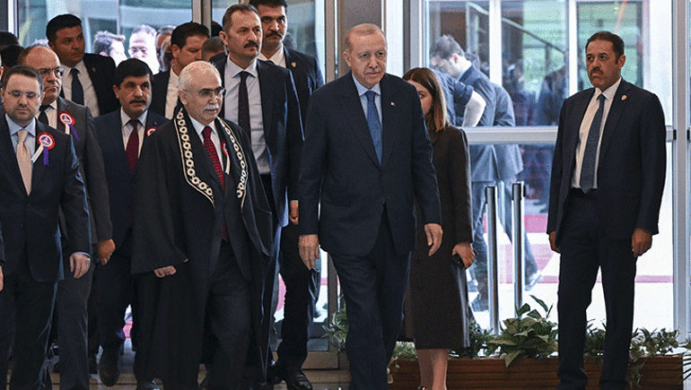 Anayasa Mahkemesi Yüce Divan Salonu’nda gerçekleştirilen törene gelişinde Anayasa Mahkemesi Başkanı Kadir Özkaya tarafından karşılanan Cumhurbaşkanı Erdoğan, daha sonra törenin düzenlendiği salona geçti.