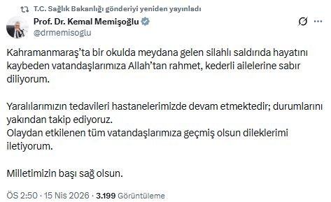 Sağlık Bakanı Kemal Memişoğlu, Kahramanmaraş'ta bir okulda meydana gelen silahlı saldırıya ilişkin sanal medya hesabından yaptığı açıklamada, "Kahramanmaraş’ta bir okulda meydana gelen silahlı saldırıda hayatını kaybeden vatandaşlarımıza Allah’tan rahmet, kederli ailelerine sabır diliyorum. Yaralılarımızın tedavileri hastanelerimizde devam etmektedir; durumlarını yakından takip ediyoruz. Olaydan etkilenen tüm vatandaşlarımıza geçmiş olsun dileklerimi iletiyorum. Milletimizin başı sağ olsun" dedi. (DHA)